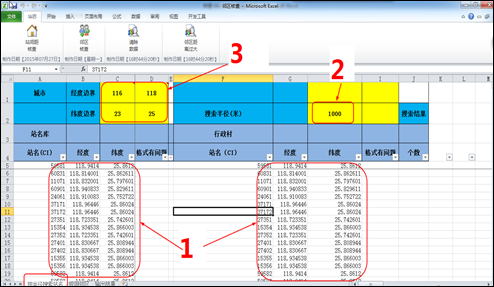 a、數(shù)據(jù)粘貼完成及手動設(shè)置半徑后,點(diǎn)擊圖5中的1【站間距核查】,等待一會兒輸出結(jié)果如圖5中的2,其中2有個別單元格的顏色為紅色,表示該站點(diǎn)與同行的F列中的站點(diǎn)共站,無填充顏色的單元格表示該站點(diǎn)與同行F列中的站點(diǎn)在設(shè)置的半徑范圍內(nèi);
