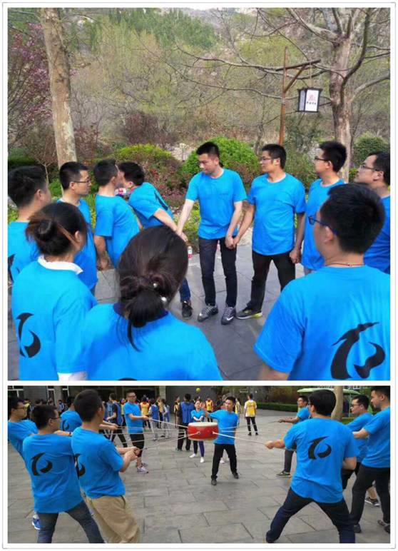 拓展訓練中還有,鼓動人心(團隊成員每人手拉一根繩子,用鼓面來擊球),群龍取水(借助團隊所有成員幫助,將自己身體完全交給隊友,筆直的放心身體,拿取指定范圍內的水瓶)讓我們深刻體會到團隊合作的重要性,更加的感悟到理解與相信,是方便留給自己還是留給隊友。